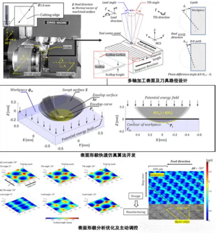 面向五轴球头铣削中的表面纹理形成问题,提出快速纹理仿真方法,实现刀具轨迹、姿态与切削参数对表面纹理演变的高效预测。相比传统试验依赖方式,该方法能够在虚拟环境中快速评估并优化纹理特征,揭示工艺参数与表面形貌之间的内在关系。研究为复杂曲面加工的表面质量可控性提供了新工具,也为精密制造中纹理设计与工艺优化开辟了新途径。